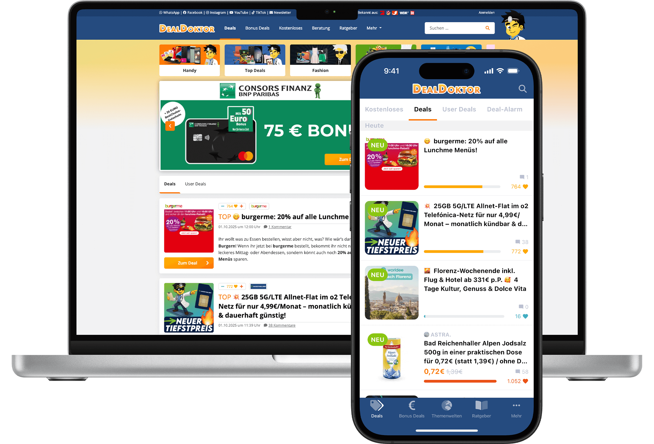 Auf DealDoktor.de und in den zugehörigen Apps für Android und Apple berichten wir täglich über die besten Schnäppchen, Deals und Gratisartikel, die in Kombination mit Gutscheinen oft unschlagbar günstig sind. Mittlerweile sind wir zu einer sehr großen Schnäppchen-Community gewachsen.