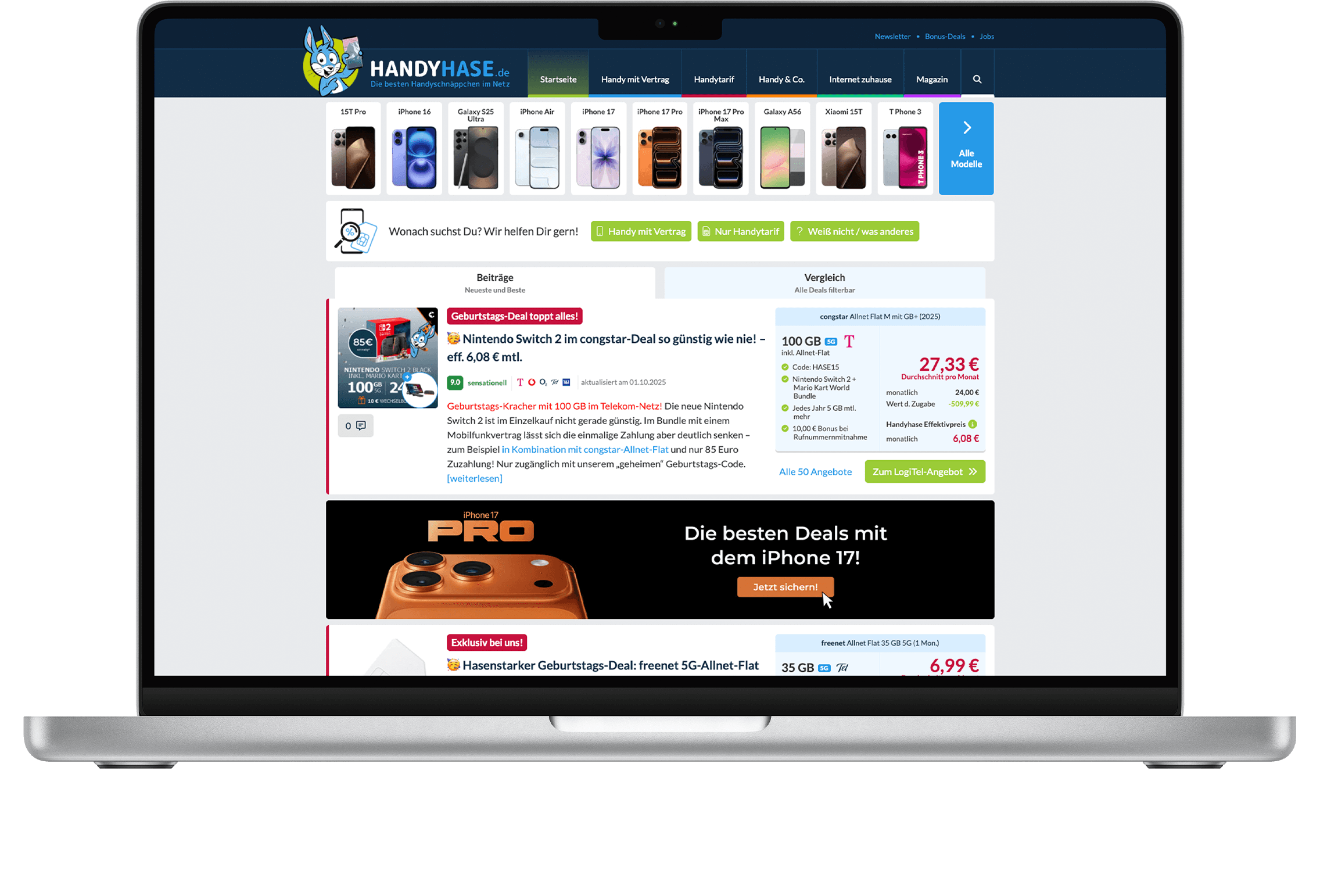 Handyhase ist dein Experte für günstige Handytarife, Smartphones und Vertragsdeals. Hier findest du die besten Kombinationen aus Top-Smartphones und passenden Tarifen zum Sparpreis.